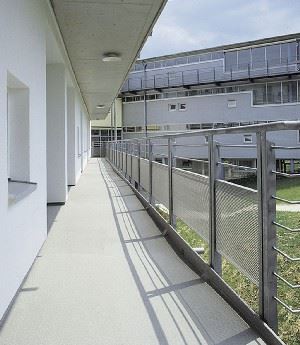 Holzroste: Auch hier gibt es verschiedene Ausführungsmöglichkeiten, wobei ebenfalls erst eine Schutzlage aus Vlies oder Bautenschutzmatten auf der fertigen Abdichtung ausgelegt wird. Darauf wird bei Belegung mit kleinformatigen Holzrosten, eine Schüttung aus Edelsplitt aufgebracht. Danach werden diese werkseitig vormontierten und mit Abstandhaltern versehenen Roste aufgelegt. Eine Verlegung eines individuell vor Ort angefertigten großformatigen Holzrostes ist natürlich auch möglich, dessen Verlegung erfolgt je nach Untergrund auch auf Edelsplitt oder durch Unterfüttern der einzelnen Tragbretter auch direkt auf die Schutzlage. Bei Ausführungen mit Holzrosten ist natürlich das sehr geringe Gewicht in manchen Fällen sehr von Vorteil, insbesondere bei der direkten Verlegung ohne Edelsplitt. Aber auch die begrenzte Haltbarkeit des Werkstoffes Holz und die mögliche entstehende "Rutschgefahr" durch eventuellen Moosansatz und ähnlichem ist zu beachten.