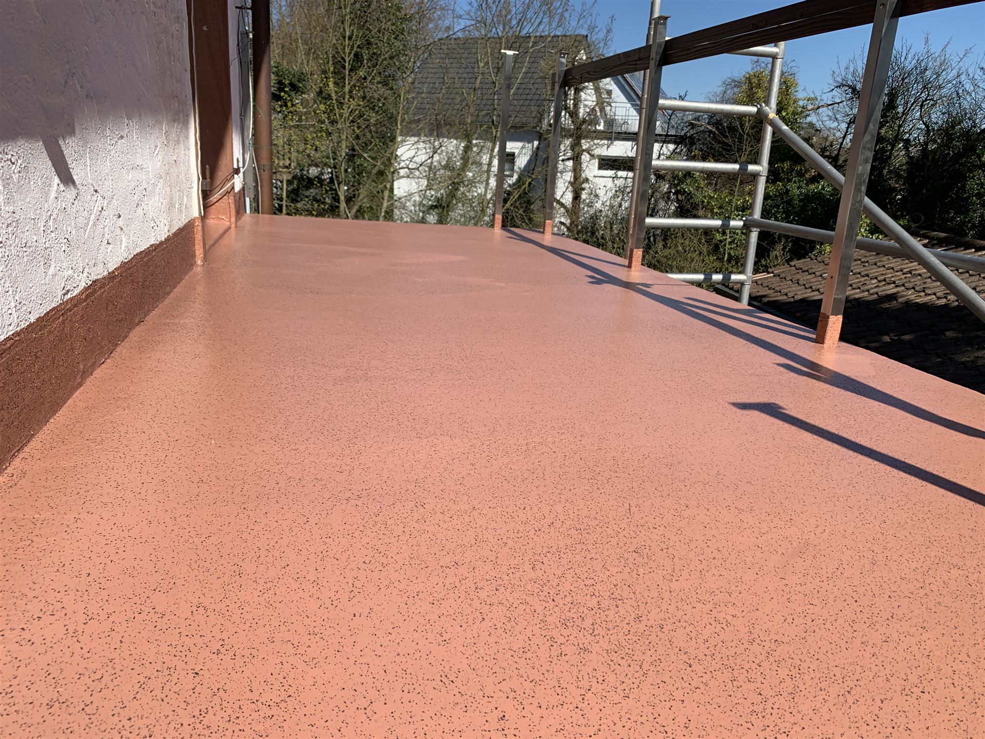 Flüssigkunststoff: Die modernste Möglichkeit der Abdichtung und Oberflächengestaltung von Balkonen und Terrassen. Vorteil hierbei sind das sehr geringe Aufbaugewicht, die Möglichkeit auch sehr komplizierte Details mit einzubinden, je nach System und baulichen gegebenheiten das Aufbringen auf die Altbeschichtung, kurze Verlegungszeiten, Pflegeleichtigkeit und die Vielzahl der Gestaltungsmöglichkeiten der Oberflächen. Die von uns benutzten Materialien der Firma "TRIFLEX", werden schon seit 25 Jahren erfolgreich am Bau eingesetzt und haben durch ständige Weiterentwicklung einen sehr hohen Qualitätsstandard erreicht. Zur Oberflächengestaltung sind 5 verschiedene Standardfarbtöne, sowie 7 Sonderfarbtöne erhältlich. Hierzu gibt es noch jeweils zwei Ausführungsmöglichkeiten durch Einstreuungen, sowie unbegrenzte Möglichkeiten durch Kombination der verschiedenen Farben.